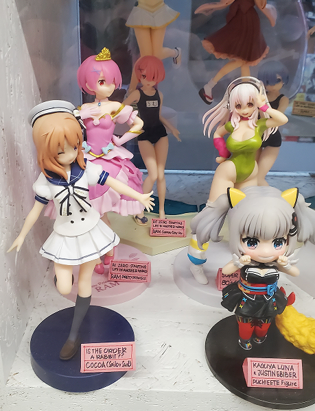 There’s Cocoa from Is the Order a Rabbit? in a lovely sailor suit, exuding a cheerful and lively vibe. Also featured are figures from Re:ZERO -Starting Life in Another World, like Ram in a pretty princess outfit and another Ram in a swimsuit. Additionally, there’s a figure of Kaguya Luna, and other charming characters from different anime series, each with distinct poses and detailed designs, appealing to anime enthusiasts.